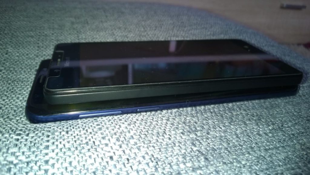 Przejdźmy więc do omawianego telefonu. Jak na 6.2″, nowy flagowiec Samsunga jest dość kompaktowy. Wszystko przez niemal bezramkowy design i proporcje wyświetlacza. Gdy położę na nim swoją prywatną Lumię 950, okazuje się, że obydwa telefony są niemal tak samo szerokie, a jednocześnie, Samsung jest wyższy zaledwie o centymetr. A przecież porównuję telefony, których przekątna wyświetlacza różni się o cal. Jeszcze ze 3-4 lata temu, sześciocalowy smartfon, był nazywany phabletem i kojarzył się z paletką do gry w ping ponga.